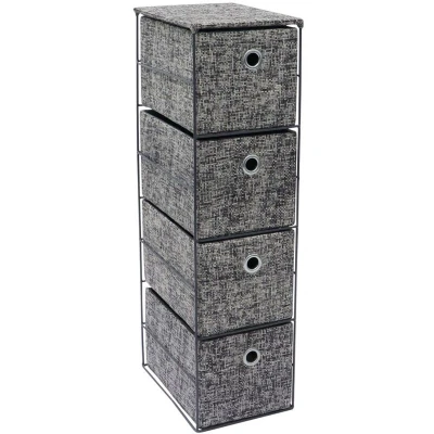 General description Our Urban storage collection features a textured inner-city fabric that perfectly complements any modern home, loft, or city apartment. This storage tower not only keeps your home neat and tidy but also adds a stylish touch to your decor. With four durable drawers, it is an essential accessory for every household, ideal for storing toiletries, makeup, jewelry, and more, helping to clear clutter and organize your space with elegance. Technical specifications Dimensions: H: 64 cm x W: 25 cm x D: 18 cm Weight: 1 kg Material: Woven fabric on a metal frame Color: Two-tone textured grey Usage This storage unit is a great addition to any living space, bedroom, or office. It is particularly useful for students in college and university settings, providing a stylish and functional solution for organizing personal items.