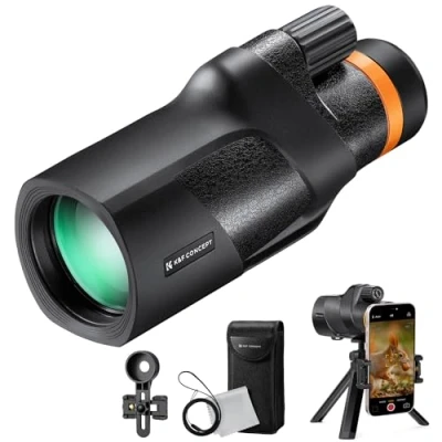 Monocular telescope 12X50 with high power zoom magnification. Get a high-quality image of 12X closer, 50mm object lens diameter monocular and unique pattern 20mm eye lens that provides a wide-angle view. Perfect for hiking, climbing, hunting, bird watching, ball games, concerts, wildlife watching and scenery. HD monocular with high-quality optics, BAK-4 prism, and FMC lens, light transmittance reaches up to 99.6%, delivers more light to the view, reduces chromatic aberration and ghost images, and gives you a clear, bright, and more colourful vision up to 1,000 yards and more. Lightweight monocular & IP68 Waterproof - IP68 waterproof design prevents splashing and is suitable for prolonged use in the rain. Upgraded quick-align smartphone mount and large height-adjustable stabilizing tripod. Compact cell phone monocular is easy to set up and provides high definition images or videos to share with friends. Easy Adjustment - By rotating the focus wheel with damping sensation, the image can be quickly brought into focus to avoid blurred images. The liftable eyepiece makes it easy to use even for users who wear glasses. Comfortable and Intimate Visual Experience - The long eye-relief that comes from the twist-up eye cup provides you with the incomparable, comfortable watching experience outdoors.