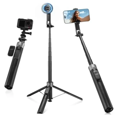 Three-in-one Design: The K&F CONCEPT phone tripod features a magnetic and clip-on design to ensure phone safety when the selfie stick is extended. Furthermore, it is compatible with 1/4-inch standard screws, facilitating quick assembly and shooting with action cameras and other cameras such as the Insta-360 X5 and Go-Pro.(When used with the DJI Osmo Pocket 3, simply pair it with an Osmo Pocket 3 handle with 1/4-inch threads.) Pop Open Quick Fold: This tripod for iPhone features pop open and lift close for quick and convenient operation. Besides, K&F CONCEPT phone tripod stand extends up to 72in/180cm, folds down to just 11in/29cm. Weighing only 0.88lb/400g, it's easy to pack away and take with you wherever you go.(Warm Reminder: Before deploying the bottom support stand, we recommend removing the remote control first to prevent loss; alternatively, you can use the included anti-loss lanyard) 4-axis Adjustable Design: The 4-axis adjustable design of this magsafe tripod lets you effortlessly capture shots from any angle. This selfie stick tripod also features a 1/4" screw mount for attaching action cameras, fill lights, microphones and other accessories, allowing you to better enjoy content creation(Our selfie stick tripod features a magnetic closure at the base, designed to prevent finger pinching) Bluetooth Remote & Stability: This iPhone tripod comes with a rechargeable Bluetooth remote, free your hands for effortless shooting. This selfie stick for Android features an aluminum alloy telescoping pole. When fully extended, its tripod legs reach a width of 15in/39cm, providing stability that makes it an ideal choice for content creators and vloggers. (Note: Avoid using heavy cameras or accessories; the telescopic tube supports up to 1,500 g in vertical load) Universal Compatibility: This selfie stick with remote is compatible with iPhone all series and Android phones, featuring a 1/4" screw mount and an included magnetic ring. This magnetic phone tripod is perfect for outdoor activities, family gatherings, live streaming, content creation, and more