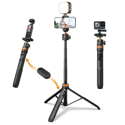 Updated 3-in-1 Multifunctional Tripod: Designed for photography enthusiasts, this tripod is compatible with cameras, actions cameras, phones and other photographic products. While focusing on tripod compatibility, the locking system has been reinforced, the grip has been thickened and the rubber feet have been widened to improve stability and comfort. Compact Travel Tripod: 33cm long when folded, it weighs just 450g and has a maximum load capacity of 3kg. It comes with a carry bag, perfect for backpacking and camping, providing you with excellent comfort and dust protection. Height Adjustable: This selfie stick tripod has 7 adjustable sections and extends from 33cm/13inch to 158cm/62inch in height. The legs are made of high quality aluminium alloy, with a maximum load capacity of 3kg, sturdy and durable, meet most of the photography and selfie needs. Panoramic Ball Head with 1/4 inch Screw: The ball head supports 360° horizontal panorama, 180° tilt and 90° vertical shooting, easy to operate and free to adjust the angle. Equipped with 1/4 inch interface and sports camera interface, compatible with cameras, mobile phones, sports cameras, binoculars, projectors and other devices. Mobile Phone Wireless Remote Control(Phone only): The included Bluetooth remote control enables quick pairing with smartphones. This Bluetooth remote control can capture photos and videos within a 10-meter range and operates continuously for up to 10 hours.