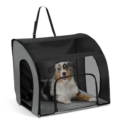 TRAVEL SAFETY CARRIER: Pet carrier provides a comfortable, safe and secure location for your pet to ride, includes a washable comfort pad and mesh windows to allow your pet to view out SAFETY FIRST: Straps loop around headrest and straps for any car seat belt to securely tethers to carrier safely in the back seat with any seat belt EASY ACCESS: Exits on both sides and front provide easy access and allow installation on either side of the backseat QUICK INSTALLATION: Quick to install and uninstall and folds flat for easy storage BRAND YOU TRUST: Designed by K&H with OVER 20 years of experience in creating innovative, quality products.DIMENSIONS: Large measures 29.5 X 22 X 25.5 Inches and holds 40 Pounds