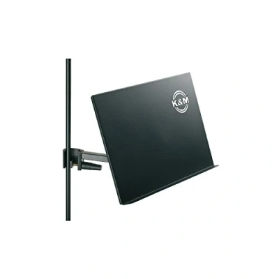 Torsion-resistant sheet music holder in steel with integrated k and m logo Made of clamping element aluminium with protective plastic inserts, steel desk Large desk; adjustable in angle and depth Available in black colour Folds very small, easy to carry