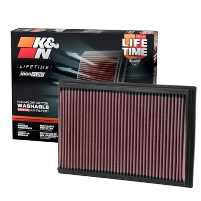 ULTIMATE LONGEVITY: 10-Year/Million Mile Limited Warranty protects for the life of your vehicle. ENGINEERED POWER: State-of-the-art filtration media provides up to 50% more airflow than disposable paper filters to increase power and acceleration; Clogged or dirty air filters can reduce your vehicle’s acceleration by up to 10%. EASY INSTALLATION: Pre-oiled and ready to drop into your factory air box; One of the easiest and most cost-effective upgrades for your vehicle for quick performance gains. SAVES MONEY: K&N high-flow replacement air filters will save you $250 over 10 years by avoiding disposable filters. ECO-FRIENDLY: Using a washable, reusable product helps reduce replacement waste; A K&N filter will last longer than 10 disposable filters.