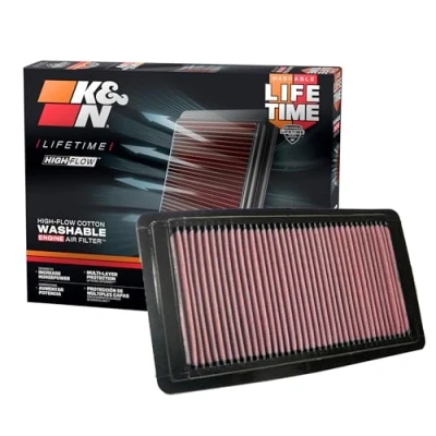 ULTIMATE LONGEVITY: 10-Year/Million Mile Limited Warranty protects for the life of your vehicle. ENGINEERED POWER: State-of-the-art filtration media provides up to 50% more airflow than disposable paper filters to increase power and acceleration; Clogged or dirty air filters can reduce your vehicle’s acceleration by up to 10%. EASY INSTALLATION: Pre-oiled and ready to drop into your factory air box; One of the easiest and most cost-effective upgrades for your vehicle for quick performance gains. SAVES MONEY: K&N high-flow replacement air filters will save you $250 over 10 years by avoiding disposable filters. ECO-FRIENDLY: Using a washable, reusable product helps reduce replacement waste; A K&N filter will last longer than 10 disposable filters.