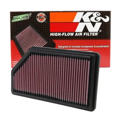 ULTIMATE LONGEVITY: 10-Year/Million Mile Limited Warranty protects for the life of your vehicle. ENGINEERED POWER: State-of-the-art filtration media provides up to 50% more airflow than disposable paper filters to increase power and acceleration; Clogged or dirty air filters can reduce your vehicle’s acceleration by up to 10%. EASY INSTALLATION: Pre-oiled and ready to drop into your factory air box; One of the easiest and most cost-effective upgrades for your vehicle for quick performance gains. SAVES MONEY: K&N high-flow replacement air filters will save you $250 over 10 years by avoiding disposable filters. ECO-FRIENDLY: Using a washable, reusable product helps reduce replacement waste; A K&N filter will last longer than 10 disposable filters.