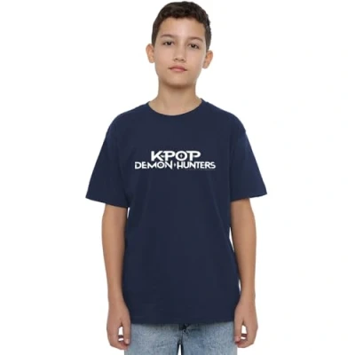 K Pop Demon Hunters White Logo Kids T Shirt, Navy, 7 8