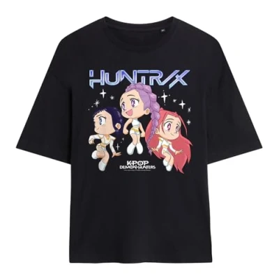 K Pop Demon Hunters Womens Kpop Huntrix Chibi Group Ladies Oversized T Shirt, Black, L UK