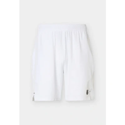 Lightweight tennis shorts engineered for freedom of movement 100D 4-Way Density Stretch fabric for superior flexibility Elastic waistband with internal drawstring for a secure fit Deep side pockets and split hemline for comfort and function Clean White design with K-Swiss logo for a timeless athletic look