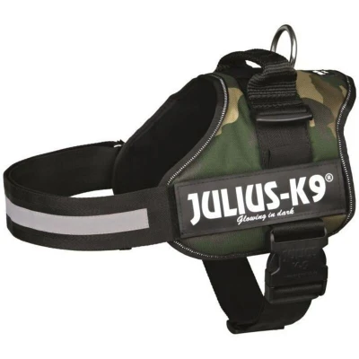 K9®Power Harness, L/1: 66–85 cm/50 mm, camouflage everyday harness, very robust with anti-allergic lining, skin-friendly and breathable, continuously adjustable with a sturdy handle, secured with a Velcro strap, reflective elements with lamp holder starting from size L/1, additional adhesive Velcro straps available separately, product made in the EU.