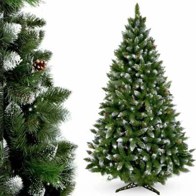 PERFECT DENSITY - The artificial diamond Christmas tree is made of high-quality PVC film. The pine tree has 391 branches, making it exceptionally dense and lush. It resembles a snow-covered fir tree in the forest. DECORATIVE HORRIF - One of the most beautiful natural decorations of conifers is hoarfrost. Therefore, the Christmas tree branches are versatile and often adorned with diamond crystals that imitate the white hoarfrost that sparkles beautifully under lamplight. DECORATIVE CONES - Our diamond pine is decorated with decorative cones with silver glitter. Combined with the hoarfrost effect, this looks impressive and makes decorating much easier. STABLE STAND - The alpine fir won't wobble under the weight of the Christmas decorations because it's equipped with a stable stand that keeps the tree balanced. The four-legged stand is made of sturdy plastic. TWO SIZES TO CHOOSE FROM - Our pine Christmas tree is available in two sizes: 180 and 220 cm. This allows you to choose the model