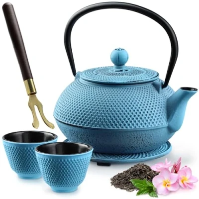 KADAX Cast Iron Teapot with Enamelled Interior 850 ml, Japanese Tea Kettle Lid, Two Cups, Trivet Stand and Infuser for Loose Leaf (Blue)