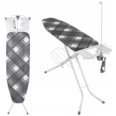 Convenient ironing: Our ironing board with a power outlet features a storage compartment, allowing you to conveniently place your clothes without leaving your workspace. Effortless steam ironing: The ironing board cover is made of a metal mesh that ensures proper air circulation while steam ironing. This allows you to work comfortably without your garments becoming damp. Adjustable height: Thanks to its adjustable height of 69 to 95 cm, the foldable steam ironing board can be adapted to your height. This is a great relief, as you don't have to bend over and avoid back and neck pain. Non-slip feet: The extra-wide ironing board, made of thick steel, is equipped with non-slip feet that guarantee stability. This provides greater comfort and significantly speeds up your work. Two color options to choose from: We offer an ironing board with a storage compartment in two patterns: "gray stars" and "checks." Choose the model that suits you best. Reduce ironing time and enjoy greater comfort!