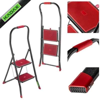 KADAX Folding Steel Ladder, Black/Red Step Ladder with Load Capacity up to 150 kg, Protection, Handrail Non Slip Steps (2 Steps)