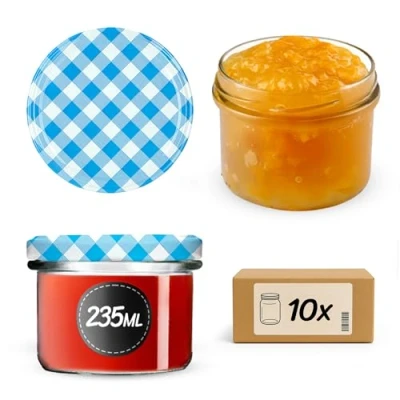 KADAX Glass Jars 235 ml, Small Preserving with Metal Lids for Homemade Jam, Marmalade and Honey, Storing Spices Herbs (Blue Grid, Set of 10)