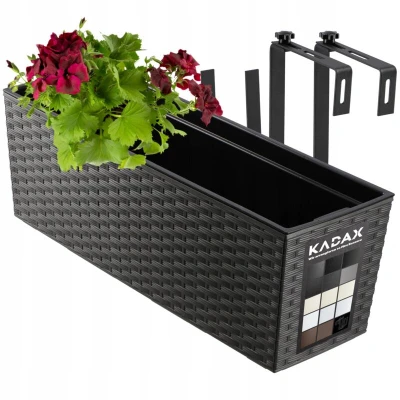 KADAX Hanging Planter 18.5 x 56 cm, Outdoor Plastic Window Box with Insert and Brackets, Long Flowerpot for Railing (Rattan Pattern, Graphite)