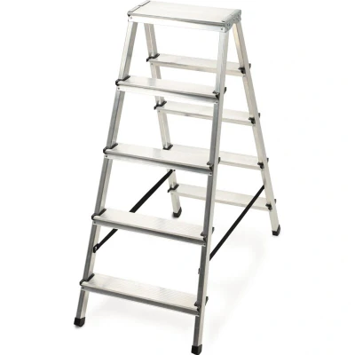 LOOKING FOR A SMALL HOUSEHOLD LADDER? A sturdy aluminum ladder with a comfortable standing platform that guarantees safe use. This fits the bill perfectly, as our high-quality, double-sided household ladder is ideal for working at low heights. It proves its worth when tidying up, renovating, or making small repairs. Its lightweight and robust construction will be especially appreciated by DIY enthusiasts and around the house. See why it's worth having! THE DOUBLE-SIDED LADDER WITH A STANDING PLATFORM WAS DESIGNED SPECIALLY FOR HOMES AND WORKSHOPS. Its simple aluminum construction with fold-out legs allows you to climb to any height. Once set up, the top rungs transform into a comfortable, wide standing platform where you can stand and work comfortably, as your movement is not restricted. Purchase our ladder and enjoy its convenience and ease of use. The maximum load capacity is up to 125 kg. The ladder is equipped with sturdy stiles with non-slip feet that guarantee stability and