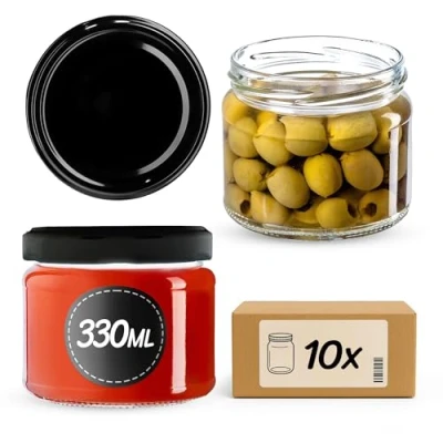 ManoManoUNIVERSAL – 330ml jars are the perfect solution for homemade fruit and vegetable preserves. Their optimal capacity allows you to easily use up your preserves without worrying about food waste. SHATTER RESISTANT – These canning jars are made of high-quality, thick glass. They are heat resistant, so you don't have to worry about glass shards during brewing and pasteurization. LEAK PROTECTIVE – The 330ml jars have tight-fitting lids that extend the shelf life of your preserves. Jars with lids perfectly preserve all your delicacies and protect them from air, moisture, and insects. FOOD SAFE – These jam jars are food-safe and pose no health risks. They contain no harmful substances that could negatively affect the smell and taste of the products. USEFUL – The 330ml jars can be used as containers for kitchen products or small desserts. They can also be used as transparent containers for small items. FUNCTIONAL – The jars have special lids. They can be used for pickled and preserved