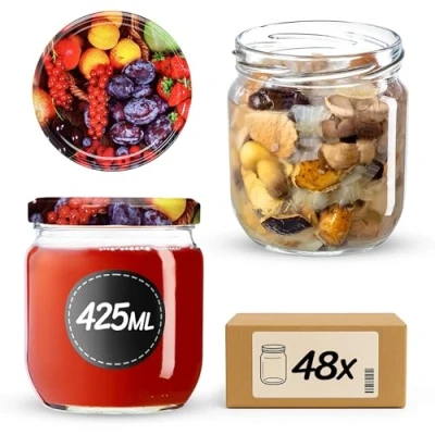 ManoManoUNIVERSAL – These 425 ml jars are perfect for storing bulk goods and liquids in any kitchen. They are also suitable for making preserves of fruits and vegetables. DURABLE – Made from thick glass, these small preserving jars are resistant to damage and cracks. Their high temperature resistance allows them to be pasteurized and boiled multiple times. FOOD-SAFE – The jars are food-safe. They do not absorb odors and therefore do not affect the taste of the contents. Furthermore, the jars are hygienic and dishwasher-safe. TIGHT-TIGHT – The jars have 82 mm diameter screw-top lids that ensure a tight seal and allow for the storage of preserves year-round. The lids protect the contents from oxygen and moisture, preventing spoilage. VARIETY – the small jars come with special lids in a single patterned color, featuring printed vegetable, fruit, and beekeeping motifs. This allows you to match the lid design to the contents. Jars with lids can be used for pickled and preserved cucumbers,