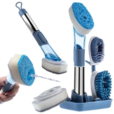 KADAX Multifunctional Dish Brush with 4 Heads, Washing Up Detergent Dispenser, Kitchen Brush, for Dishes, Soap Dispenser (Blue)