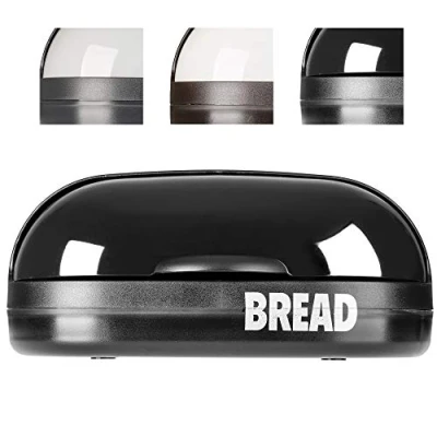 AmazonPreventative: This bread bin is cleverly designed to prevent premature drying and protect baked goods from mould, fungus, and pests. It extends freshness of bread by up to two days. Capacious: With dimensions of 14.6in in length, 7.9in in width, and 6.3in in height, this item offers ample storage space for fresh and delicious baked goods, such as croissants, bagels, doughnuts and rolls. User-friendly: The item is fitted with a convenient large lid that opens quietly and gently, minimizing the risk of disturbing sleeping children or irritating guests with an unpleasant creaking sound. Modern design: This breadbox is not only visually pleasing with its delicate colour and shape, but is also a versatile addition to any interior style – whether modern, traditional or art deco. Durable: The bread bin is constructed from lightweight, high-quality plastic which is highly durable and resistant to moisture, scratches, and impacts.