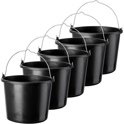 KADAX Plastic Bucket 12L, Large Builders with Metal Handle for Cleaning and Plastering, Black Construction Cement, Paint (Set of 5)
