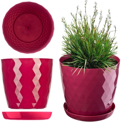 A pot with a saucer, ideal for flowers, plants, herbs, or small vegetables. Available in four colors and five sizes. UV-resistant – it won't change color under light. This pot will be an ideal addition to your interior design. You can plant any combination of plants in it, choosing those with similar light and humidity requirements, or create a display of identical flowers in a variety of colors or a single color. The modern design will look great in any house, apartment, office, or vacation home. The pot is perfect for creating unique floral arrangements. You can combine your plants as you like, using one, a few, or even a dozen pots. The glossy finish and interesting pattern give it a unique look. This pot allows you to plant several different plants. It is ideal for houseplants such as orchids, cyclamen or African violets, Sansevieria trifasciata, Chlorophytum, Ceropegia, Guzmania, Begonia, bromeliads, cacti, Dracaena fragrans, Kalanchoe, potted roses, and various types of ferns.