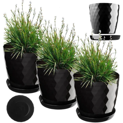 KADAX Plastic Flower Pot, Set of 3, Durable Plant Pot with Saucer, Decorative Planter in Several Colours for Indoor Use (Black, 20 cm)