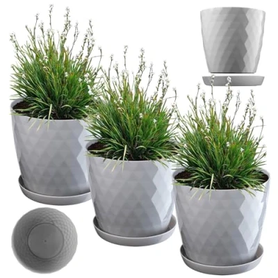 KADAX Plastic Flower Pot, Set of 3, Durable Plant Pot with Saucer, Decorative Planter in Several Colours for Indoor Use (Grey, 25 cm)