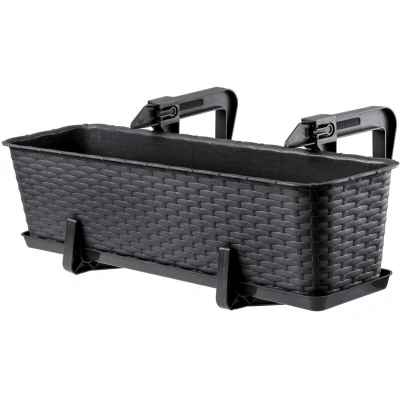 KADAX Rattan like Planter, Plastic Hanging Box with Brackets, Drainage Holes and Saucer, Rectangular Long Plant Pot for Balcony, Railing (60 cm, Anthracite)