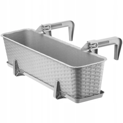 KADAX Rattan like Planter, Plastic Hanging Box with Brackets, Drainage Holes and Saucer, Rectangular Long Plant Pot for Balcony, Railing (60 cm, Light Grey)