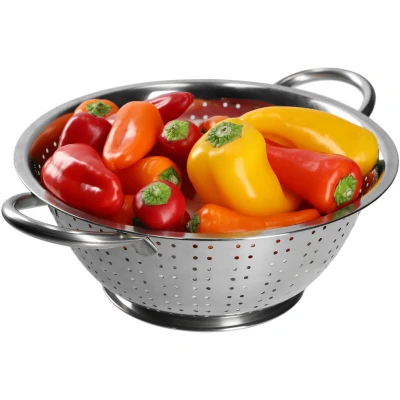 This practical pasta strainer is a useful addition to any kitchen. It's suitable for straining cooked vegetables, pasta, grits, and rice, as well as for conveniently washing fruits and vegetables. The strainer prevents spaghetti and very thin pasta used in soups or salads from clumping together. This strainer is an indispensable part of any kitchen. Ideal for preparing various meals such as breakfast, lunch, snacks, and dinner. Thanks to the pasta strainer, you can easily and quickly strain cooked vegetables such as tomatoes, cucumbers, carrots, cauliflower, lettuce, radishes, and broccoli. The round pasta strainer with its rolled edge allows you to quickly and easily wash fruit from your garden or supermarket. Washing grapes, strawberries, plums, raspberries, cherries, blueberries, apples, pears, or apricots has never been easier! The colander has a diameter of 23 cm and a height (from bottom to top) of 9.5 cm. It is equipped with two practical handles for easy handling. A solid base