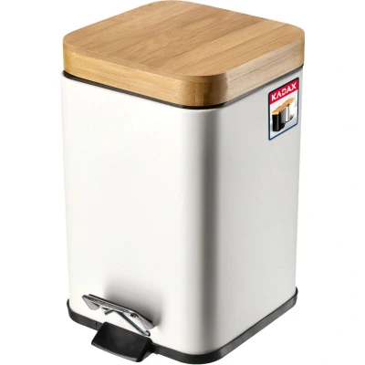 KADAX Toilet Bin, Powder Coated Steel Kitchen Waste Bin with Bamboo Lid, Small Bathroom Trash Can Foot Pedal and Internal Bucket (3L, White, Rectangular)