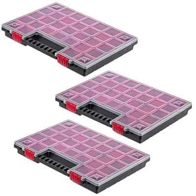 Useful: the tool box is part of the basic equipment of every hobbyist. With its help you keep your tools tidy. It is worth having it always at hand. Functional: the assortment box has two removable universal boxes. This allows you to adjust the interior to the quantity and size of the parts. The organiser is excellent for storing screwdrivers, hammers and nails. Sturdy: the case and the clear lid are made of a robust plastic. The screw case is equipped with robust fasteners. Comfortable: the assortment box has a comfortable handle that allows you to carry it anywhere comfortably. The clear lid allows you to quickly check the contents and find necessary accessories. Various models: the assortment boxes are available in three sizes 28.7 x 18.6 x 5 cm (6 boxes), 34.4 x 24.9 x 5 cm (18 boxes) and 39.9 x 30.3 x 5 cm (21 boxes). We offer sets of 1, 3, 6 and 12 pieces.