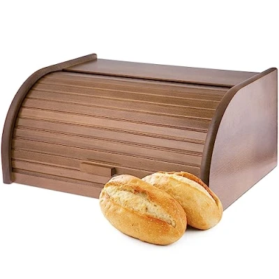Preventative: The wide lid of the bread bin creates an airtight seal that prevents baked goods from drying out, ensuring that they remain fresh for longer. It also act as a protective barrier against dirt, germs and bacteria. User-friendly: The breadbox has a non-slip base, which adds extra stability and prevents it from sliding around. In addition, the roll-top lid features an ergonomic handle that simplifies the process of opening or closing it. Durable: Made from natural wood, the bread bin offers superior durability and mechanical resistance in comparison to ceramic or plastic alternatives. Classic design: Our bread box has a timeless and visually pleasing design that complements various kitchen styles. It is available in four colour options: honey, brown, dark brown and natural wood colour. Spacious: With a length of 15.3 inches and a width of 11.2 inches, the bread container offers ample storage space for all your favourite baked goods, keeping them fresh and delicious for longer.