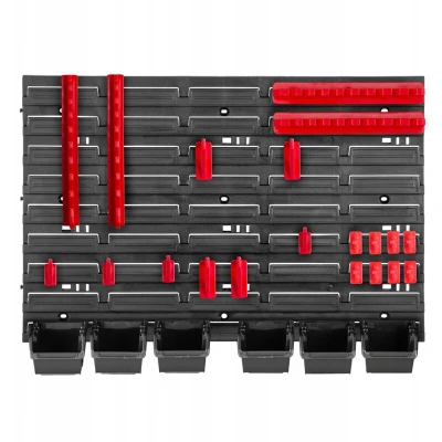 Perfect tool organization: with our storage system, you'll forget the hassle of searching for nails or screwdrivers forever. Everything will be within easy reach in one place. Robust construction: the wall shelf is made of sturdy PP plastic, which is resistant to chemicals and external factors, including UV radiation. Modular system: you can connect individual tool holders as needed, as the workbench is modular. The storage rack allows you to organize your tools individually according to your needs. Two colors to choose from: the workshop wall shelf is available in 9 variations. Each model can be purchased in red and black. The set includes: 1x tool wall 58x39cm, 6x black storage bins 11.5x8x6cm, 1x tool hook set. Forget the hassle of searching for a tool forever! Invest in perfect workshop organization. With this workbench, you can perfectly organize the space in your garage, basement, or workshop. It allows you to store both larger items like hammers and screwdrivers, as well as