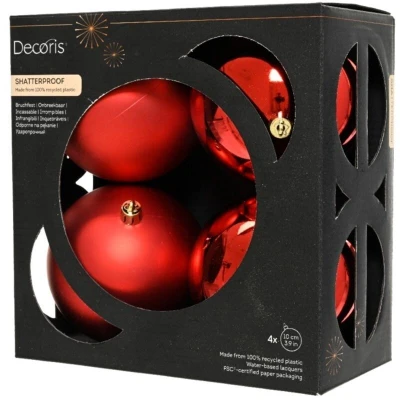 ManoManoGeneral description Kaemingk shatterproof red baubles are perfect for adding a festive touch to your Christmas decorations. This pack includes four baubles, each featuring a mix of shiny and matte finishes, making them a stylish addition to your holiday decor. Technical specifications Size: 100mm Material: Shatterproof Color: Red Pack includes: 4 baubles