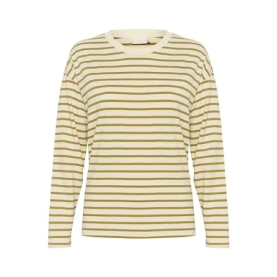 KAFFE Women's T Shirt Long Sleeves Boxy Fit Crew Neck Tee Cotton Jersey, Ant. White/Green Moss Stripe, L