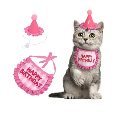 Kaket Cat Birthday Outfit, Puppy Bib, Small Dog Party Hat, Bandana, Pet Accessories (Pink 2)