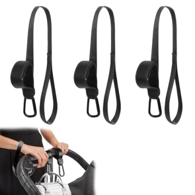 Kaket Leather Pushchair Hooks 3PCS, Buggy Clips for Handbags, Stroller Hook with Anti Slip Rope (Black)