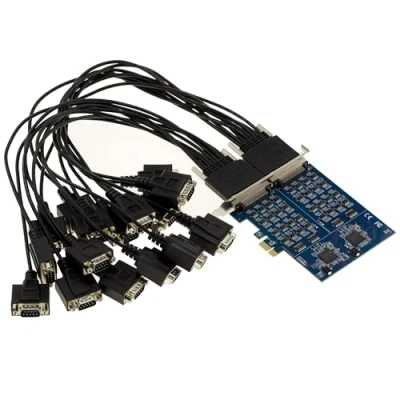 For desktop PCs on PCI Express 1X port. Allows you to add 16 RS422 / RS485 SERIES ports to your desktop PC. Compatibility: Compatible with all motherboards, all serial devices. Drivers included for WINDOWS XP, Vista, Seven, 8, 10, 11, Server 2003/2008/2012, Linux 2.6.27 / 2.6.31 / 2.6.32 / 3.x.x and later. EXAR XR17V358 Dual Chipset. PCI Express 1x port (will fit on 1x/2x/4x/8x/16x slot). RS485 signals: DATA+ (B)/DATA-(A)/GND RS422 signals: T/R+ T/R- RXD+ RXD- GND 16 DB9 connectors on two cords (2x8) with insert plate. Protection 600W, and 15KV ESD. Operation: Asynchronous, point/point, point/multipoint, 2 wires (half duplex), 4 wires (full duplex). Maximum transmission distance 1.2 km, support 7/8 data bit - 1 or 2 stop bit - even/odd/mark/space/none. None, hardware and xon/xoff flow control. Load capacity up to 32 equipment per port. With DB9/domino plates for wired mounts.