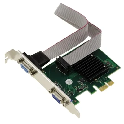 Connects to a computer's PCIe port and allows you to add two VGA displays to duplicate or extend your display on monitors. Compatibility: Compatible with Windows 7, 8, 8.1, 10, 11 as well as Linux (Ubuntu, Fedora, RedHat...). Chipset: Silicon Motion SM750 Dual DAC 300MHz Built-in 16MB DDR. 90°, 180° and 270° display rotation possible. 128-bit 2D graphics engine: ROP3, BitBLT, transparent BLT, patterned BLT, color expansion, line drawing, YUV to RGB 16/32 bit conversion. Support 7 Layers Display: 2 hardware sliders, main graphic, video, alpha video, alpha, secondary graph. Compatibility with ITU601 and ITU656 standards, V to RGB 16/32 bit conversion. Features 2 VGA DB15 ports, maximum resolution up to 1080p or 1900x1200. Intended use: office only (no 3D motor) Comes with low profile and high profile brackets.