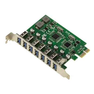 For desktop PCs on PCI Express x1 port. Allows you to add 7 external USB 3.0 ports to your desktop PC on a rear bracket. Compatible with Windows 11, 10, 8.1, 8, 7, Vista, XP, 2000 (32/64). Equipped with two NEC D720201 chipsets. PCIe 2.0 1x type card (compatible with 1x, 2x, 4x, 8x, 16x ports). 7 USB 3.0 5G ports on bracket, type "A". Backwards compatible with USB 2.0 and USB 1.0. Reinforced capacitors that allow the card to be self-powered by the PCIe port. Does not require external power recovery. Supplied with driver CD.