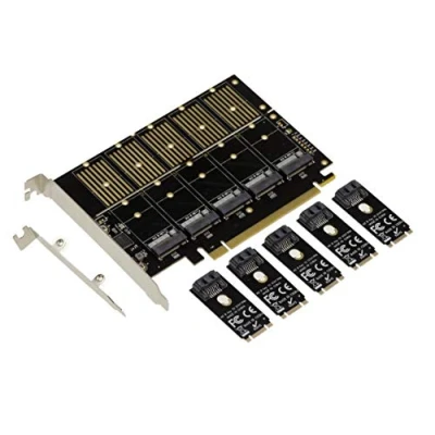 This card allows you to control five M.2 SATA SSDs in B Key or B+M Key. Adapters are supplied to replace the M2 ports with standard 7-pin SATA ports. For all M.2 "B+M Key" or "B Key" SSDs, but only SATA type. JMB585 CHIPSET. For 16x type 3.1 PCIe slot. PCIe GEN3 x2 bus bandwidth. Compatible with PCIe link layer power saving mode. 5 ports for M.2 SATA B-key or SATA hard disk (adapters supplied). Complies with SATA Revision 3.2 specifications. AHCI, NCQ, SATA link power saving mode compatible. Compatible with SATA plug-in detection. Drive power control compatible. Partial/Slumber SATA power management. Compatible with types 2230/2242/2260/2280. The card is fully powered from the PCIe port. The 5 SSDs are supported by the PCIe port, they will be seen as 5 disks. Drivers for Windows 10 / 8 / 7 / Vista / XP / Server 2003 / 2000 and Linux. The card is "breakable" in low-profile format, and supplied with a low-profile bracket to be fitted in place of the original bracket. It will then only support 2230 or 2242 SSD disks, or SATA disks (using the adapters supplied).