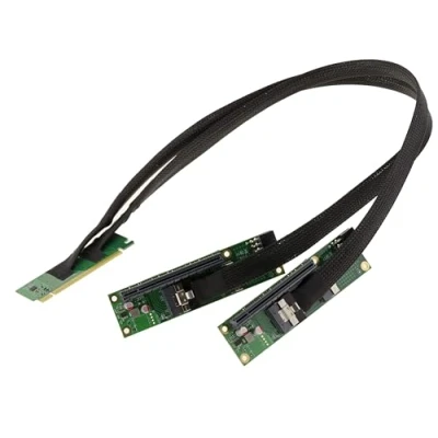 To connect two PCIe cards offset to a PCIe x16 port. Female ports are physically the size of x16 ports, but their bandwidth is x8. PCIe Gen 4.0 type riser, for use on a Gen 3.0 or Gen 4.0 port. PCIe Gen 4.0 x16 throughput of 32GB/s. Requires support from x16 to x8/x8 bifurcation mode. Connections provided by SFF-8654 8i plugs. Tablecloth length: 70 cm each. Power recovery via 6-point connector on each remote plate. Size of the plates carrying the PCIe female ports: 145x38x15mm. Dimension of the plate carrying the PCIe male port: 104x40x15mm.