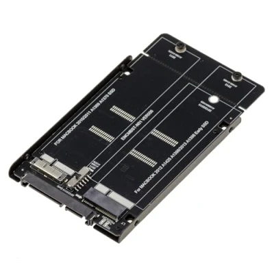 This adapter turns any Apple SSD that owns the 2010, 2011 or 2012 Macs into a standard SATA SSD format. Thanks to its dual slot and ingenious design, it allows you to reuse an Apple SSD in a PC, external enclosure or any 2.5-inch SATA-enabled slot. The adapter supports all Apple SATA SSDs from recent Macs before 2013: Apple SSD 6+12pin (MacBook 2010-2011), Apple SSD 18+8 pin (MacBook Pro / MacBook Air / Mac Pro 2012). Compatible with "narrow" SSD of Mac Retina 2012, and "wide" SSD of Mac Pro 2012 A switch between the two slots allows you to choose the SSD used. Note: Only one SSD can be active at a time. Mounted on a 2.5" metal chassis, this adapter fits like a traditional hard drive into any standard slot: 2.5" format Simple mounting with included screws Compatible with any SATA media or enclosure The set also includes the necessary screws and screwdriver to attach the SSD to the adapter. The output connector is a standard SATA 15+7 pin, consisting of 15 pin (power) + 7 pin (data). Compatible with all standard SATA cables and slots.