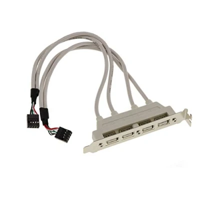 Transform a motherboard's internal USB 2.0 connectors into usable USB 2.0 ports. Maximum transfer rate 480 MBps. 2 internal USB 2.0 Female connectors. 1 bracket with 4 USB 2.0 type A ports (2 ports available per internal port connected). Cable length between 9-pin plug and bracket: 25cm.