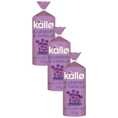 The information below applies to each unit in the pack Kallo Blueberry & Vanilla Rice & Corn Cakes: Moreish berry and vanilla flavoured puffed rice and corn crackers, ideal for snacking. Vegan friendly, and full of delicious flavour – great for on the go Made for snacks: Ideal for packed lunches, lunch boxes, family day trips, picnics, or in the office. A healthier way to keep hunger pangs at bay after school, at work or for mini meals at home Low fat rice and corn cakes: Delicious snacking made using good, honest, natural ingredients and not an artificial additive in sight. No nasties at all, just outstanding flavour and less than 3% fat Gluten free: No artificial colours, flavours or preservatives. Coeliac friendly. A good source of fibre, made with wholegrain brown rice. Great topped with strawberry fromage frais, peach or banana Better by nature: Discover our natural, organic foods and seasonings. At Kallo, we promise to make light work of healthy eating - giving everyone the freedom to enjoy what they want, when they want