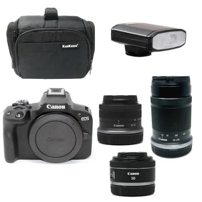 KamKorda Camera Bag + Flash R50 Mirrorless RF S 18 45mm 55 210mm 50mm f/1.8 STM lenses, 24.2MP APS C CMOS Sensor, UHD 4K Video 2 Year Warranty