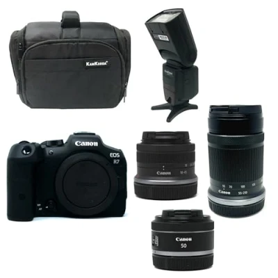 KamKorda Camera Bag + Flash R7 Mirrorless RF S 18 45mm 55 210mm 50mm f/1.8 STM lenses, 32.5MP APS C CMOS Sensor, 4K60 10 Bit Video 2 Year Warranty