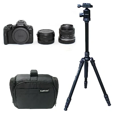KamKorda Camera Bag + Tripod R50 Mirrorless Digital Body Black RF S 18 45 f/4.5 6.3 IS STM Adapter, 24.2MP APS C CMOS Sensor, UHD 4K Video 2 Year Warranty